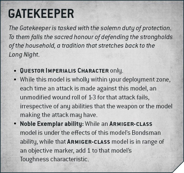 As long as this model is in your deployment zone it can’t be wounded on a 1-3 roll to wound. Furthermore, Armigers get +1 toughness while under the effects of the Gatekeeper’s Bondsman Ability! That’s one way to make sure your line holds.