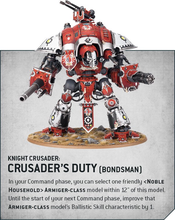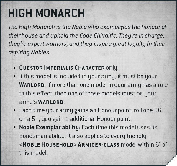 The restriction is that the Imperial Knight must be your Warlord. However, everytime you gain an Honour Point, you can gain an additional one on a 5+ roll. And, perhaps more importantly, when they use their Bondsman Ability it applies to all friendly Armiger-class models within 6″ which can be quite the boost!