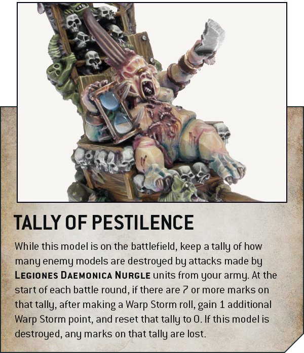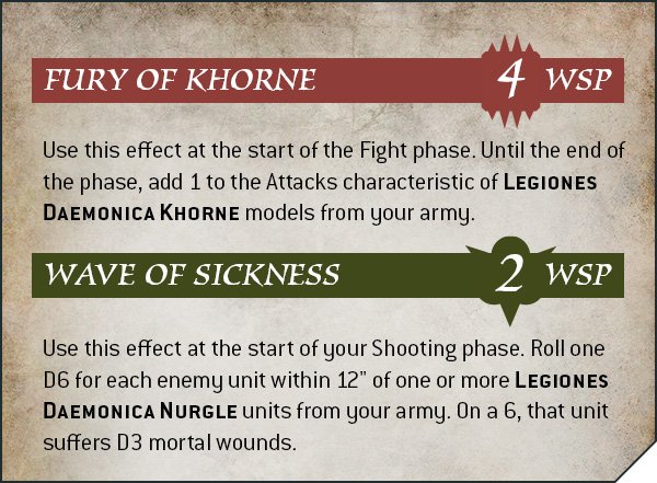 Khorne gets to unleash their fury with +1 attack to all Legions Daemonic Khorne in your army. Yeah. ALL of them. For Nurgle, they get to spread their plagues to enemy units within 12″ and cause D3 Mortal Wounds on a 6.
