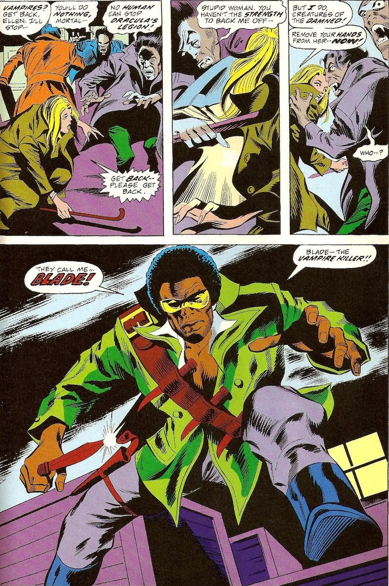 After the two parted ways, Blade’s main mission was to kill vampires and find the one that took his mother’s life. His first outing had him join the Secret Invaders and take on Vampire Luftwaffe during WWII. In the late 1960s, he joined a band of slayers out to get Dracula by playing to the ancient vamp’s desire to take over the world. They nearly killed him. Dracula is a recurring nemesis of Blade’s – he’s been killed and resurrected multiple times. Blade even battles members of Dracula’s family.