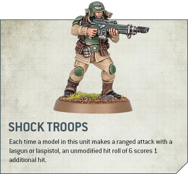 First up we get a look at the humble Shock Troops rule. This one basically makes your 6s to hit score one additional hit! It’s only for Lasguns or Laspistols however — sorry fancy melta or plasma!