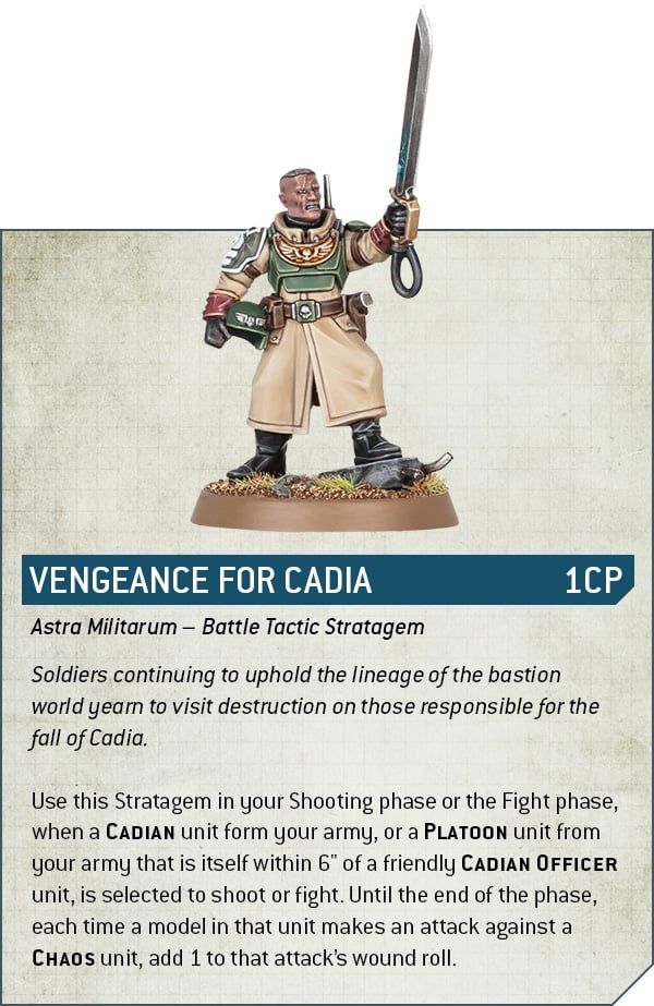 Next up we get a look at a stratagem. This one’s a +1 to wound rolls for a unit within 6″ of a friendly Cadian Officer. Considering how they can get a boost to their hits from the previous rule this extra +1 to wound could really come in handy.