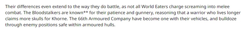 We’re using a screen shot so we can always come back to this paragraph. Turns out that not all World Eaters warbands are mindless melee berzerkers. The “Bloodstalkers” prefer to keep a distance and take skulls from range. The 66th Armoured Company stick with the vehicles and bulldoze the enemy from the safety of their hulls! This is… disturbing. Imagine if the World Eaters learned to balance their melee prowess with some combined arms. It’s almost like GW is trying to tell us that softening up targets from range is a good idea BEFORE you unleash the melee units. Who would have guessed!?