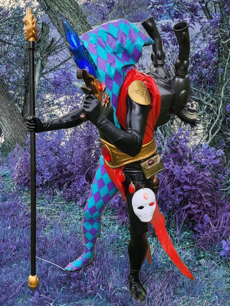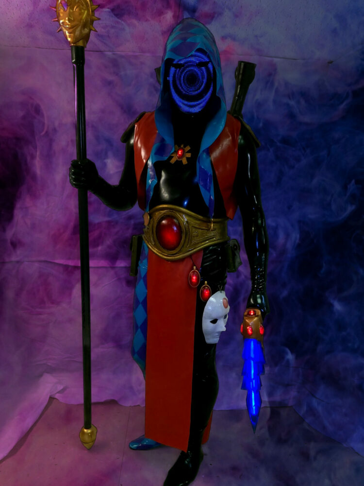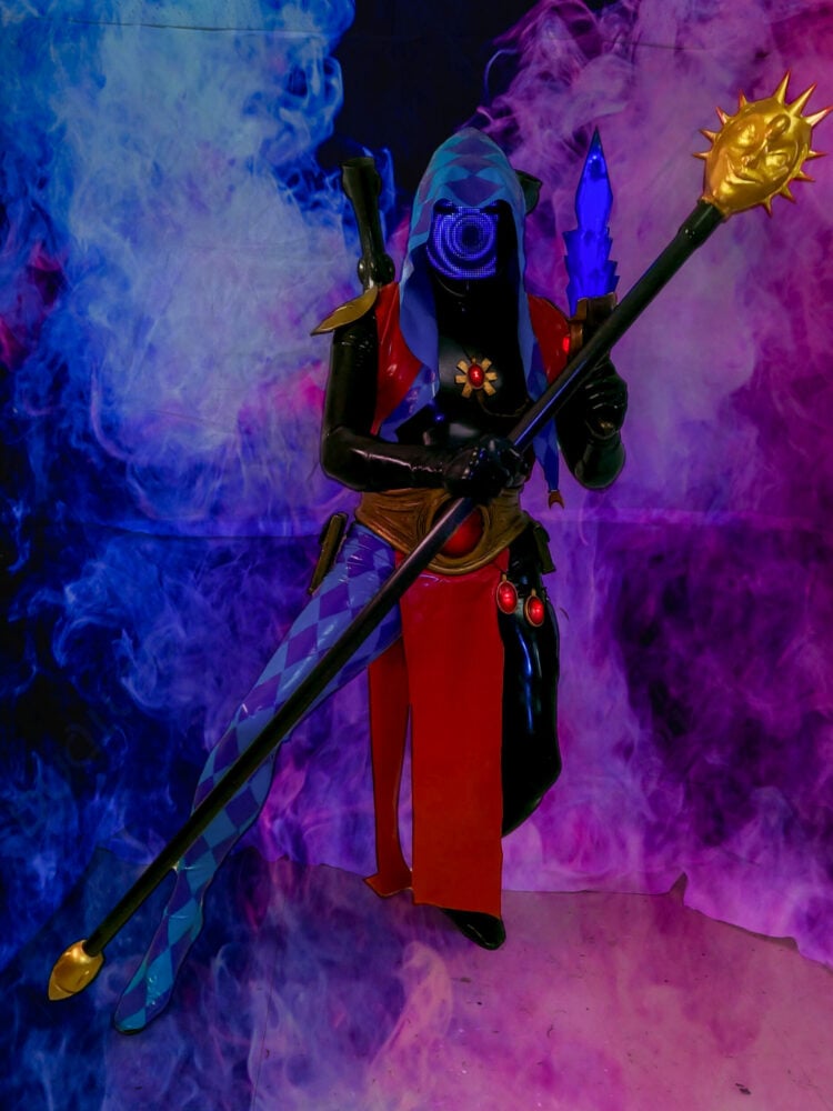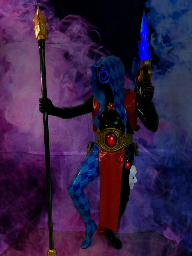 The Harlequins worship Cagorath, and are the protectors of the Black Library. They harness the devastation of the shadows and turn combat into a lethal dance. They are known for their bright, vibrant colors and wild patterns. Cosplayer Mike Curran decided to take on this wild bunch in his recent cosplay. What’s particularly fascinating about this build is the use of LEDs to bring the soul stones and face mask to life.