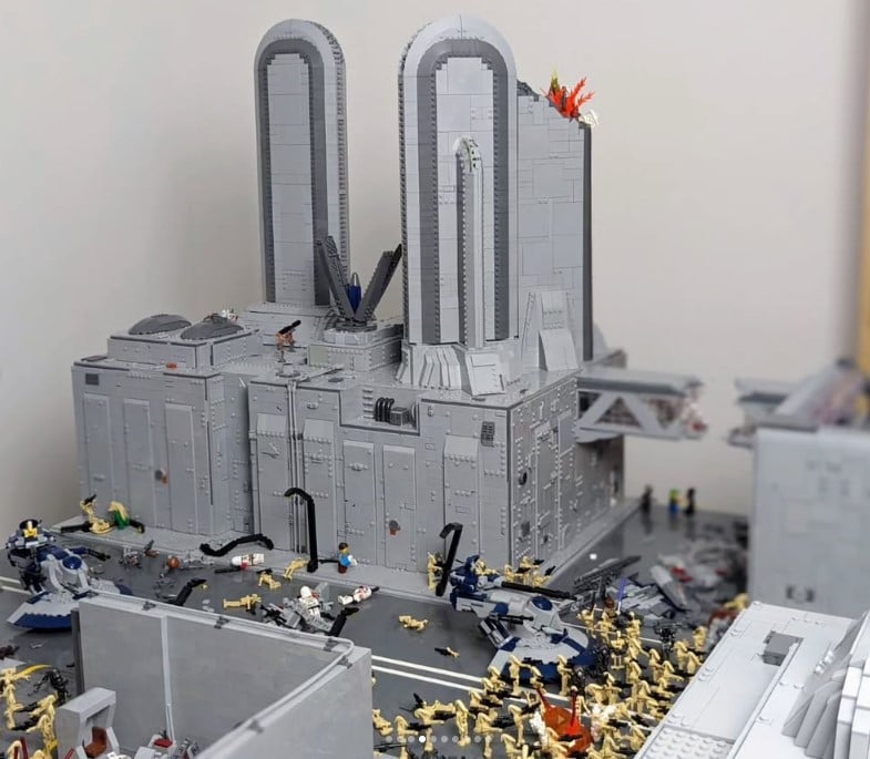 This is really a cool and huge MOC. It includes over 100,000 pieces. Over 300 minifigs in the various armies are fighting, and around a dozen vehicles are fighting in the streets. The whole thing is on a decently sized table that appears to be around 6×3 ft in size (that’s a rough guess). It’s also a couple of feet in height. The creator behind this MOC is Coconut Brick Studios – heck them out on Instagram and YouTube.