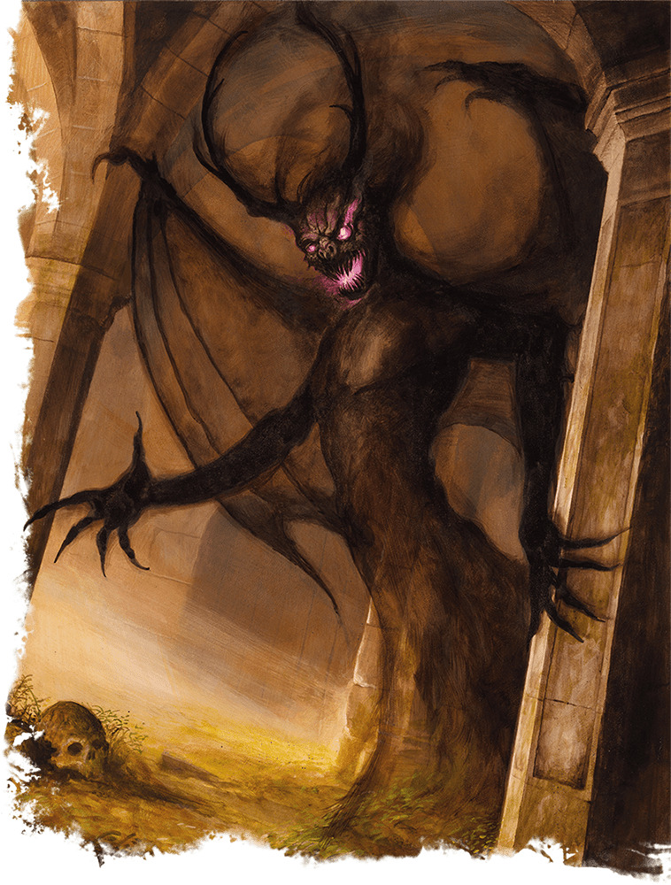 Shadow demons form when exceptionally wicked demons are destroyed and prevented from reconstituting their physical forms in the Abyss. This might occur due to divine intervention, when a demon is destroyed in the Abyss, or under more unusual circumstances. Shadow demons are the incorporeal remnants of these destroyed demons’ evil. They usually vaguely resemble their former shapes, but some take purposefully deceptive shapes. Many lurk in dark places or venture out only at night to hide their true forms from those they manipulate