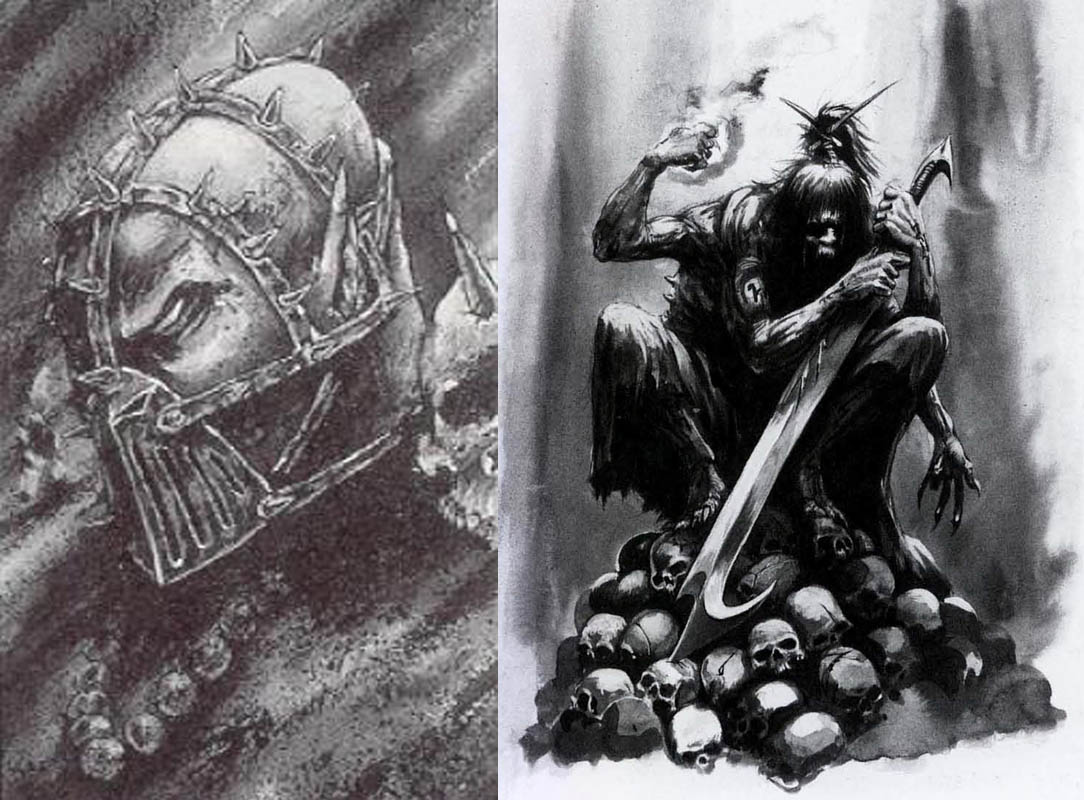 For eight millennia, Kheradruakh killed seemingly at random, occasionally joining a realspace raid unexpectedly or working as an assassin for a steep price in souls. He would hunt his prey for decades across a dozen worlds if necessary, lying in wait for weeks to await the perfect moment to strike. He took the heads to his lair where he stripped them to the bone, smashing those that did not meet his requirements, but adding the few that did to one of the thousand niches in the hemispherical walls. Each skull, still containing an echo of the soul, stared at the same point above the central dais. During the Long Midnight in 891.M41, he claimed an unprecedented seven worthy skulls in only six cycles.