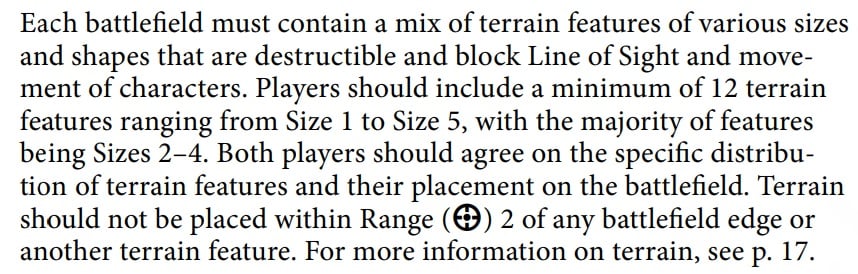 Here’s where I think things get a bit more interesting. In the core rules (page 9 under “creating the battlefield”) the amount of terrain suggested a minimum of 12 pieces ranging in sizes 1-5 with the majority being sizes 2-4.