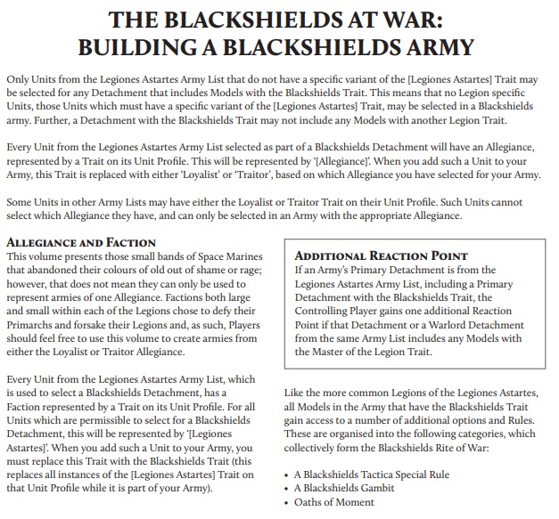 The Blackshield have no new units in their rules. However, they do gain the new Blackshields Trait as well as a new Rite of War and a bunch of Oaths of Moment. These really let you get in there to customize your Blackshields how you want. Not all Blackshields are renegades and marauders. Some of them might be psychically endowed or perhaps clones. You get to choose you how you envision them and use the thematic rules to build them out.