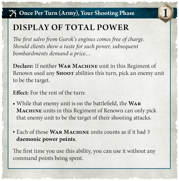 “Should these artillery become the focus of enemy spellcasting, return fire, or swift raiding parties, Daemonsmith Gurok can cast a spell that reinforces his and their armour, ignoring the first damage point allocated to each of them in each phase until the start of your next turn.”