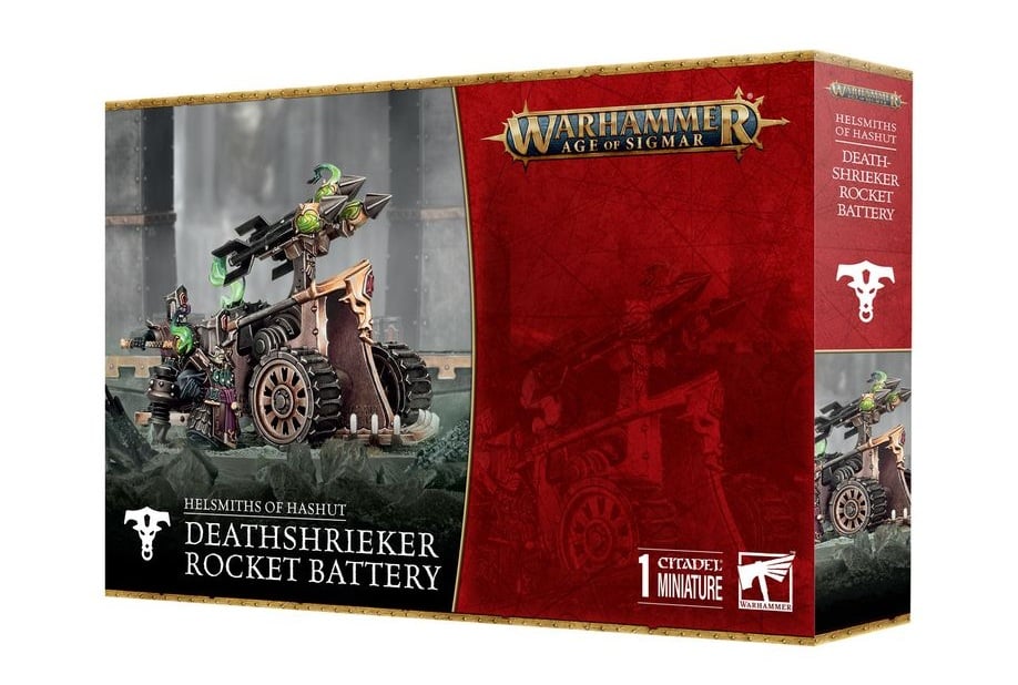 This multipart plastic kit builds a Deathshrieker Rocket Battery, a terrifying siege engine for your Helsmiths of Hashut armies in games Warhammer Age of Sigmar. Ingeniously designed by the chaos-touched duardin, these rockets fuse daemonic energies with potent warheads, capable of taking down even the largest targets. The kit includes two duardin and a hobgrot to crew your devastating war engine, which is adorned with Hashutite runes and the bull motif, making for an excellent painting project.