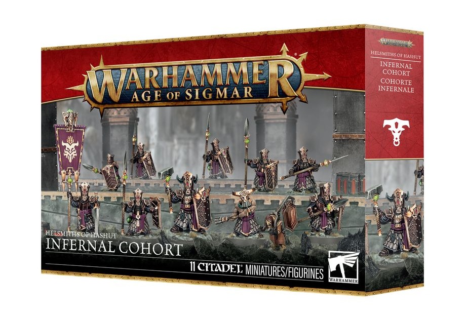 his multipart plastic kit builds 10 Infernal Cohort warriors, and their gong carrying Hobgrot – durable and strong infantry for your Helsmiths of Hashut armies in games of Warhammer Age of Sigmar. They can be armed with your choice of infantry-chopping Hashutite blades or more defensive Hashutite spears. These hardy troops are ideal for holding objectives or trudging through enemy fire.
