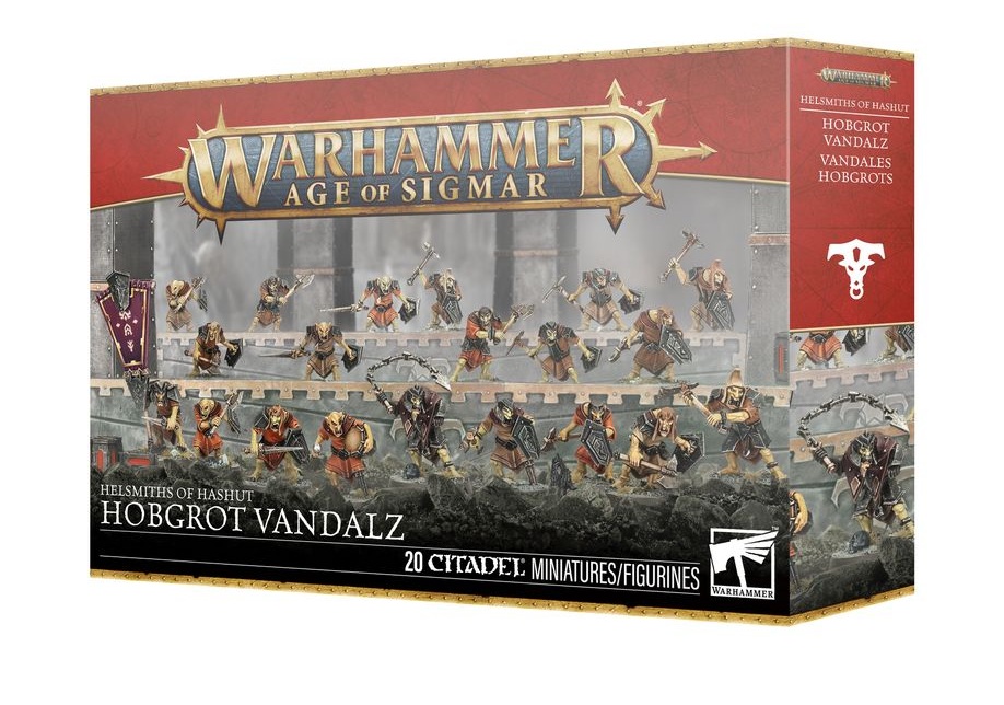 This multipart plastic kit builds 20 Hobgrot Vandalz, light infantry for your Helsmiths of Hashut armies in games of Warhammer Age of Sigmar. They are ideal for overrunning your foes, protecting vital units, and taking exposed objectives. Equipped with shields and scavenged weapons, including a mix of hammers, blades, and picks, they are ready to get stuck in. The kit also includes parts to build two optional standard bearers, musicians, and champions armed with your choice of dagger or chain weapon.