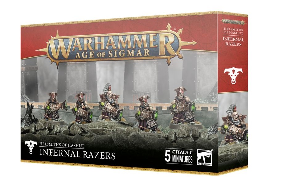 This multipart plastic kit builds five Infernal Razers, infantry wielding heavy firepower for your Helsmiths of Hashut armies in games of Warhammer Age of Sigmar. Heavily armoured and equipped with devastating Grizmalok blunderbusses or light infantry-roasting Karagthrun flamehurlers, they are ready to protect vital objectives and deal death from afar. The kit also includes parts to build an optional champion for your unit of death-dealing warriors.