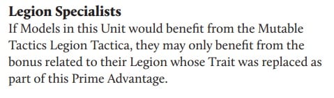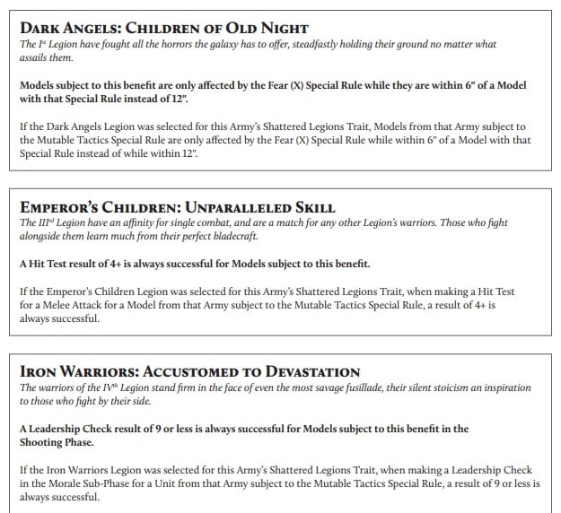 Within the rules, you’ll find the new Mutable Tactics. Each of the 18 Legions has their own version of this rule. Below are just three examples.