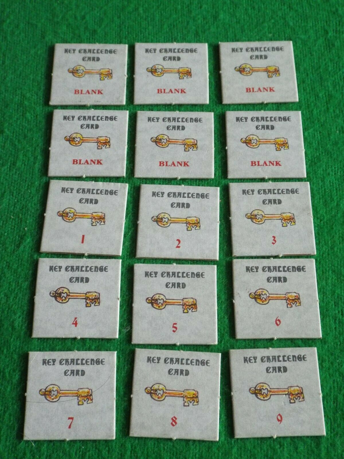 The game comes with several key challenge tokens, each numbered 1 – 9. Three of them are set aside to form the secret combination to the chest. The rest (and a few blanks) are distributed to the players. And just like in your great aunt’s favorite game, Clue, now all players have some knowledge of what key cards are not part of the actual combination.