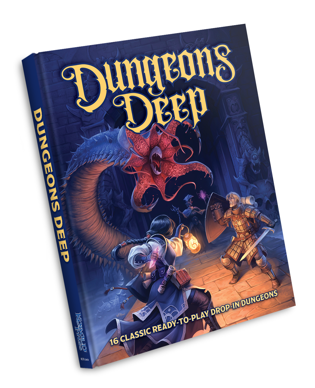 Dungeons Deep delivers 16 drop-in dungeons designed to fit neatly into your D&D campaign—or to quickly expand an existing dungeon of your own design. Each dungeon offers tiered monster-loadouts for low, medium, and high level PCs—so you have 48 options available!