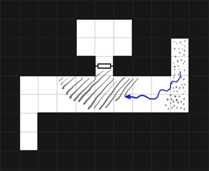 - Gray hatching shows an area of effect for an intense smell coming from the room to the north of the door.