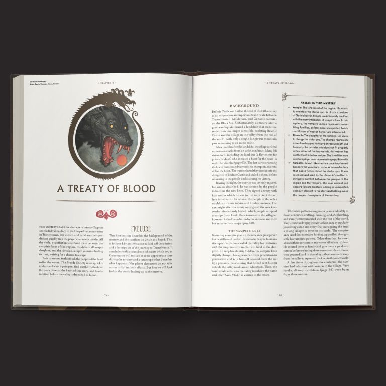 Besides the monster section and the new campaign setting stuff, you’ll also find three adventures. These are short mysteries that help unfold the world as it is laid out in the setting book. There’s one set in Prague, one in Ukraine, and one in Transylvania. That’s about as classic horror as it gets.