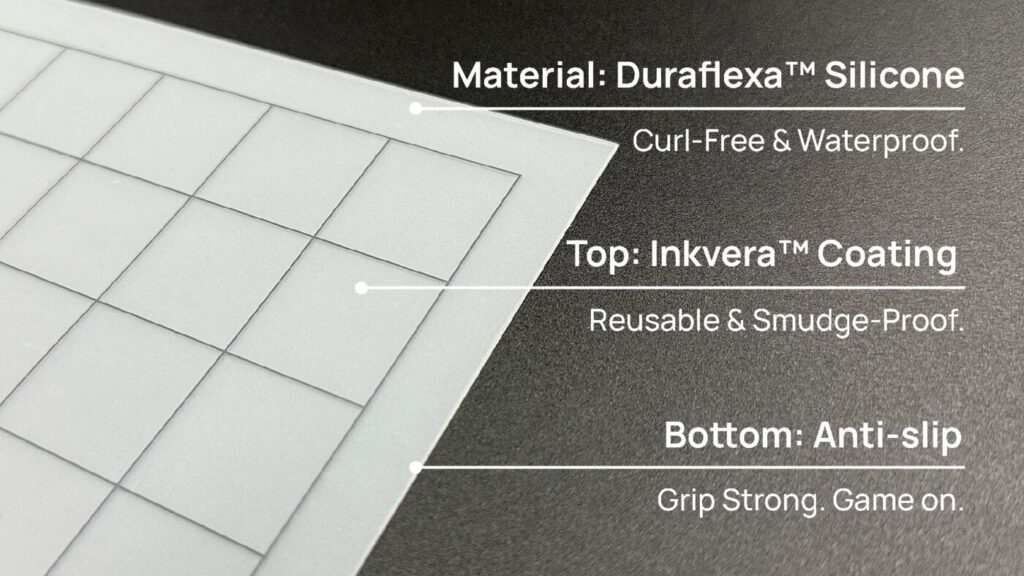 It is not PVC, paper, or standard plastic. The proprietary Duraflex™ + Inkvera™ build ensures a flat-lay experience, durability for long-term campaigns, and effortless cleaning without staining or ghost marks.