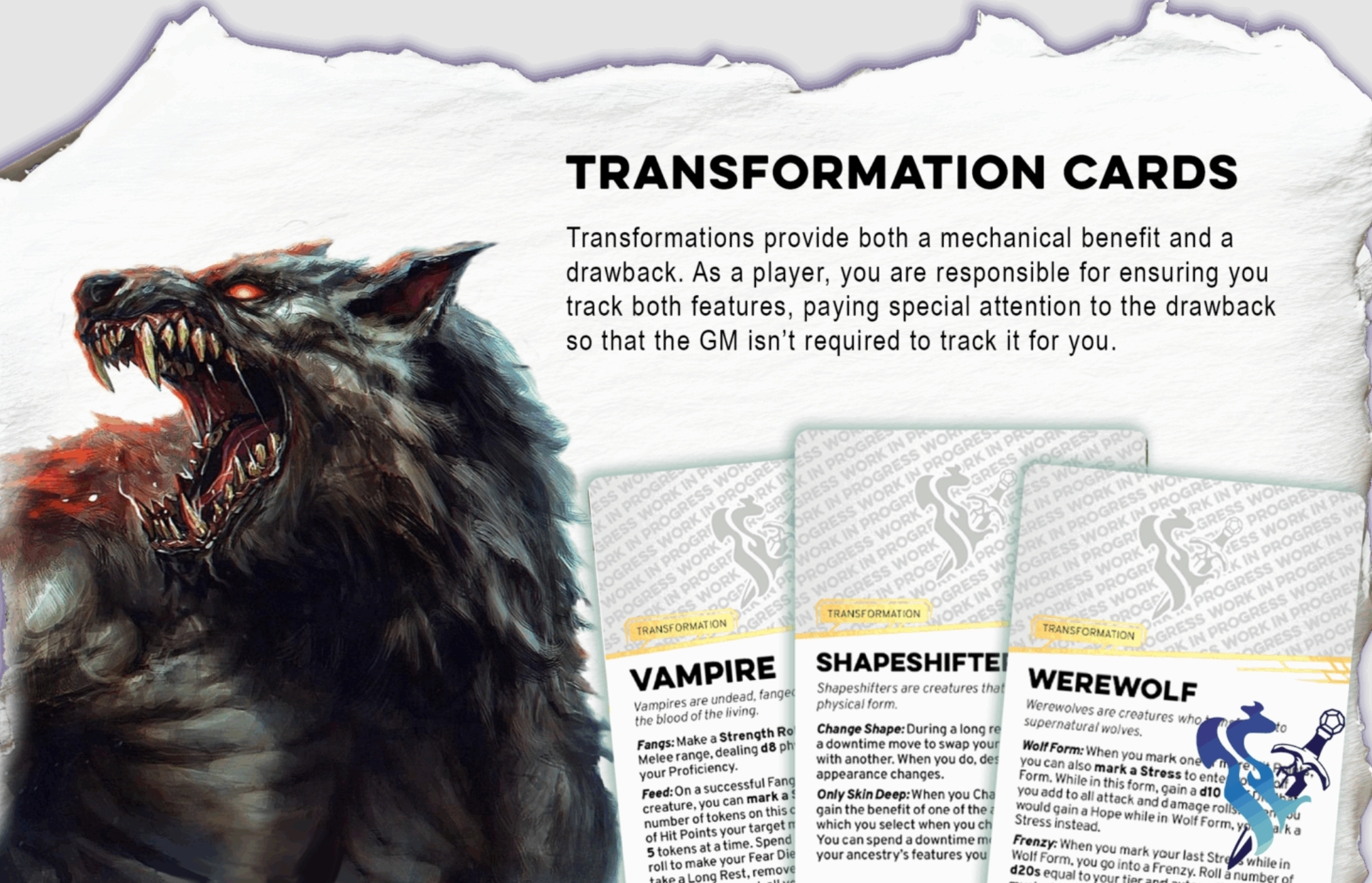 Finally, Order of the Lycan lets you become a Werewolf, which uses another new mechanic introduced alongside the Bloodhunter playtest: transformations. These are special cards that a GM can hand out to characters whenever the story makes sense. These are things like Ghost or Werewolf or even Demigod.