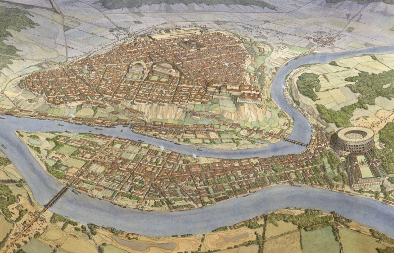 As an important city and birthplace of Emperors, the city got its fair share of monumental Roman construction. Evidence suggests that Gallic gods were worshiped in the City alongside the Roman ones. The local rivers were a major source of trade and income as well. All in all, the city is a prime example of a classic Roman city outside of Italy. Rich and multicultural, with massive monumental public buildings.