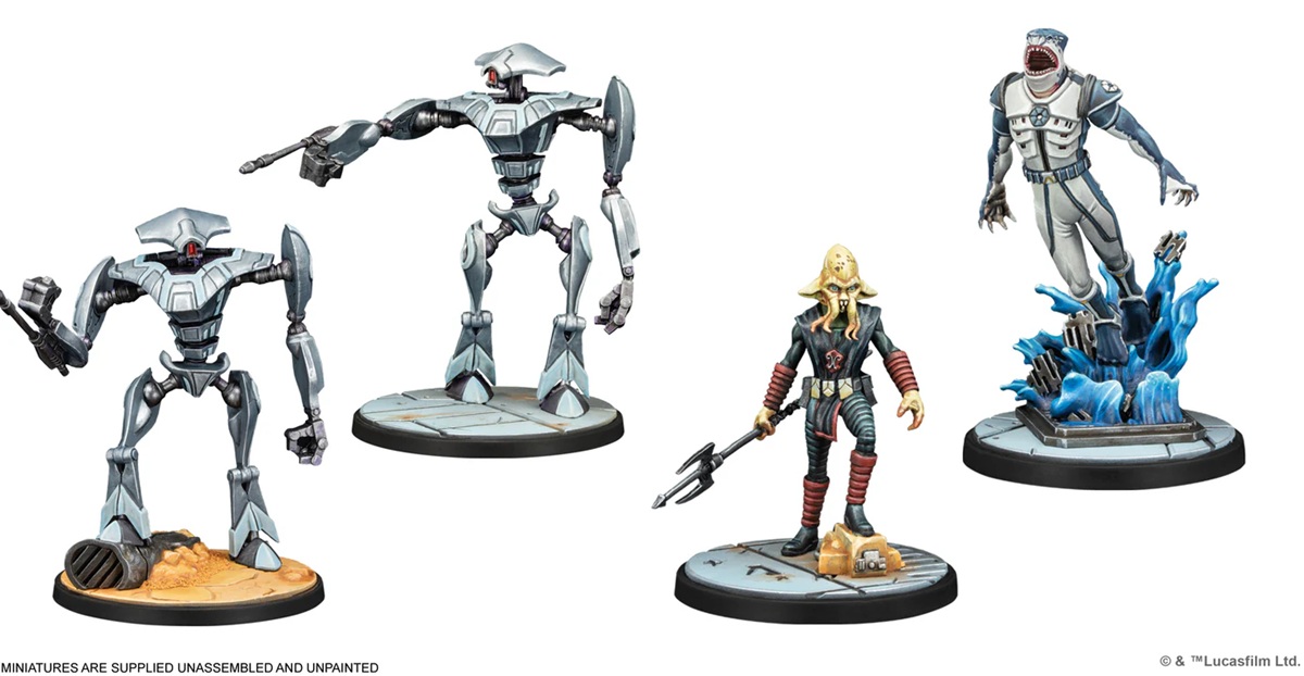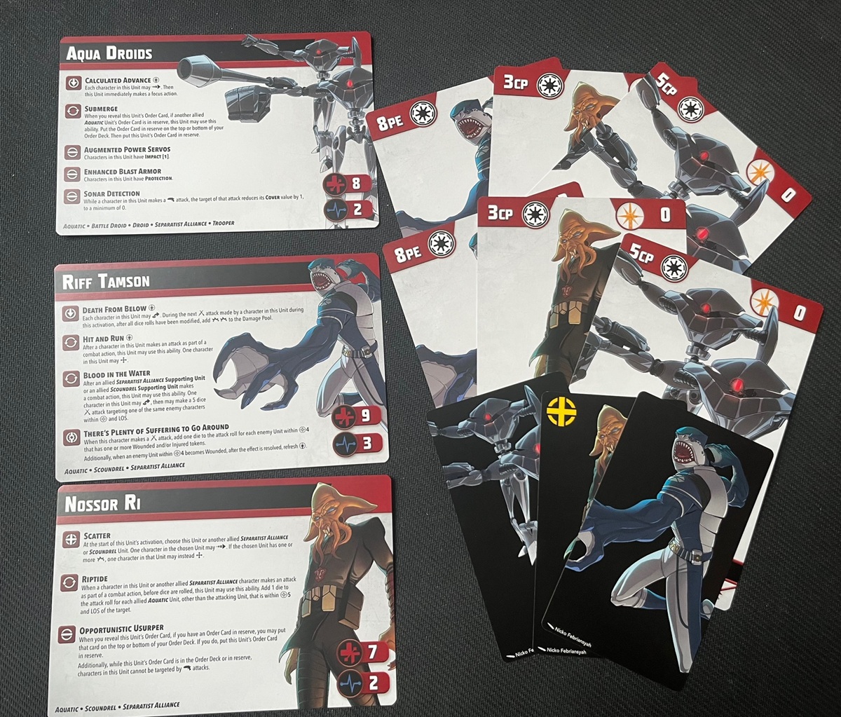 Riff Tamson uses speed to surprise and cripple his foes while Nossor Ri grants additional bonuses when allies use elevation and terrain to their advantage. Rounding out the squad are Aqua Droids, which are highly durable fighters that excel at frontal assault.