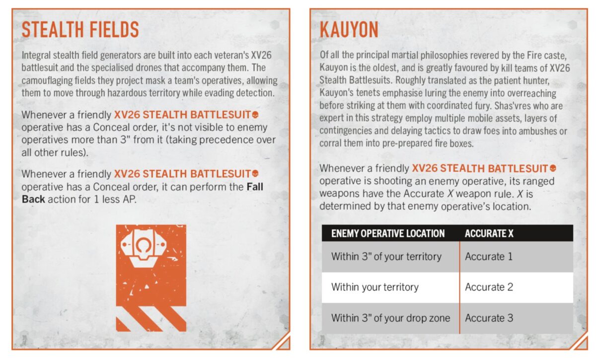 With the ball firmly in their court, XV26 specialists use the martial philosophy known as Kauyon – or the Patient Hunter in Low Gothic – to draw in their prey and launch devastating ambushes. As the enemy creep closer to their territory, targeting solutions are carefully plotted, and the resulting salvo strikes with unerring accuracy.”