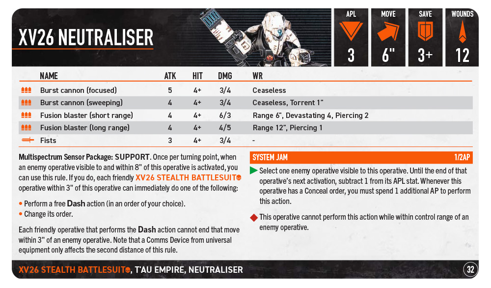 “An XV26 Stealth Battlesuit kill team is made up of five operatives accompanied by two loyal drones, and you have to bring the Shas’vre squad leader and drones along every time. In addition to the Neutraliser above, your roster looks something like this”