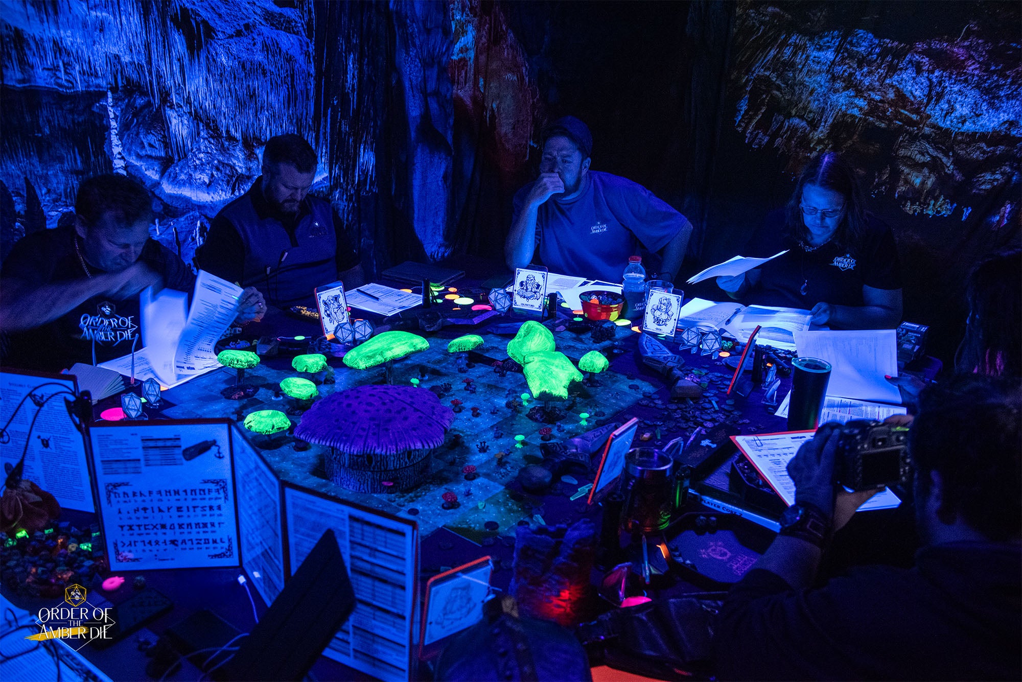 This adventure took our family of dwarves into the Darklands to recover the clan dagger of King Taargick, and we decked out the studio for it. The black lights were fired up, and the floor was carpeted with glow-in-the-dark balloons to represent the spores we kicked up as we waded through some of the thickest fungi-filled caverns. Adam even surprised us with neon confetti explosions when mushrooms went pop. If you want more detail of what it was like at the table during this marathon, or you just want to confirm that our GM does actually dance in glee when the Amber Die drops a natural 20, check out Runehammer’s marathon commentary.