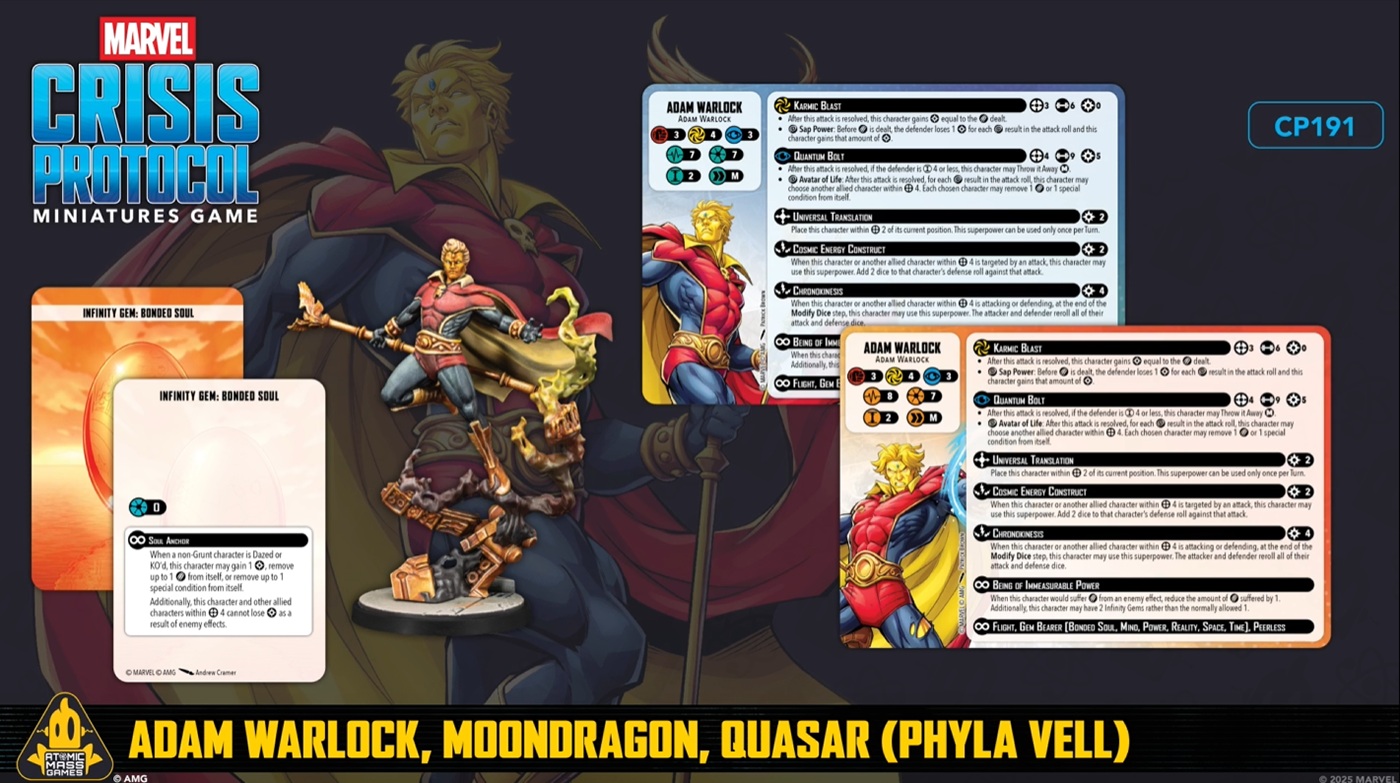 Adam Warlock’s showcase was really impressive. He’s a whopping Threat 7! But he’s worth it as he’s basically the Anti-Thanos. Oh, and comes stock with the gem Bonded Soul Infinity gem.