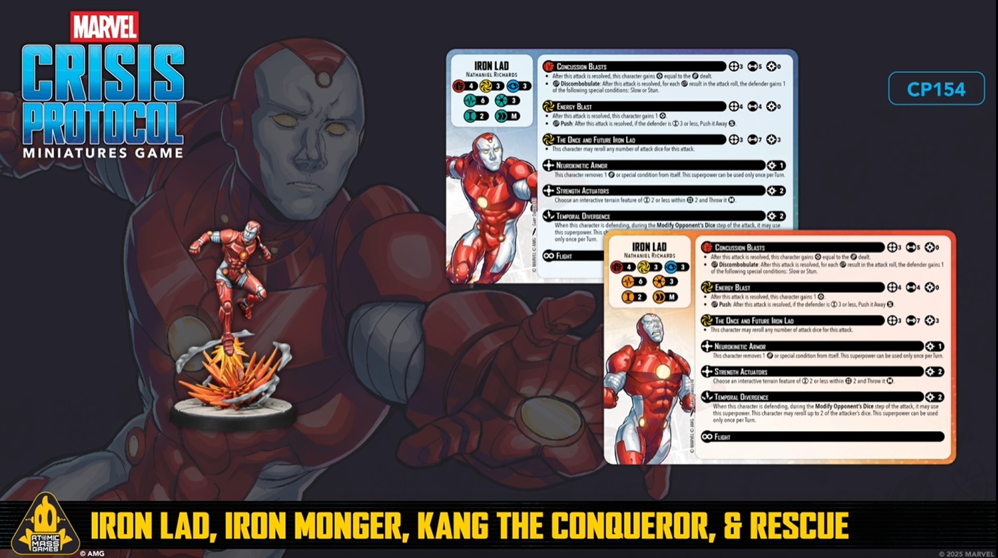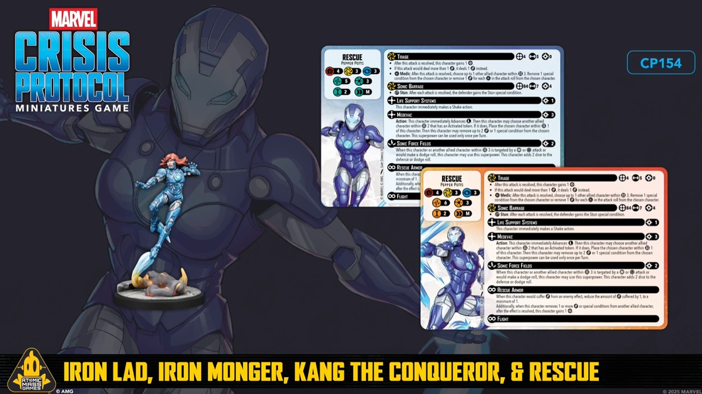 These character will all be included in an upcoming Affiliation Pack. Each one adds a little something new to the game. Rescue is the first full-on healer for MCP (even beyong Wang). Iron Monger is a threat 3 character on a 65mm base! And Iron Lad and Kang both have some chronal shenanigans to pull.