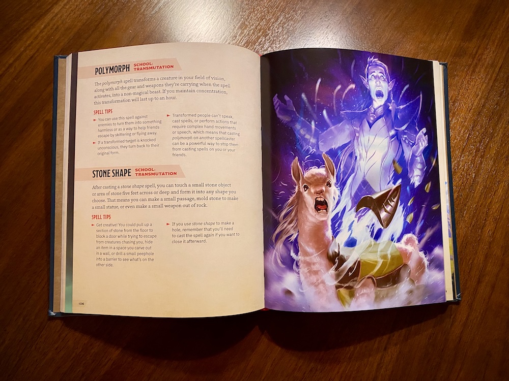 In Warriors & Wizards, you’ll find inspiration for your charatcer. Whether that’s picking your class and background, or figuring out what kind of weapons, spells, and other gear they might use. And as you can see from some of the way the book is laid out, they present you with how a piece of D&D works and why you might want to use it. I think this is especially good for Wizards and other spellcasters – there’s some great advice about when you might want to use Polymorph, for instance.