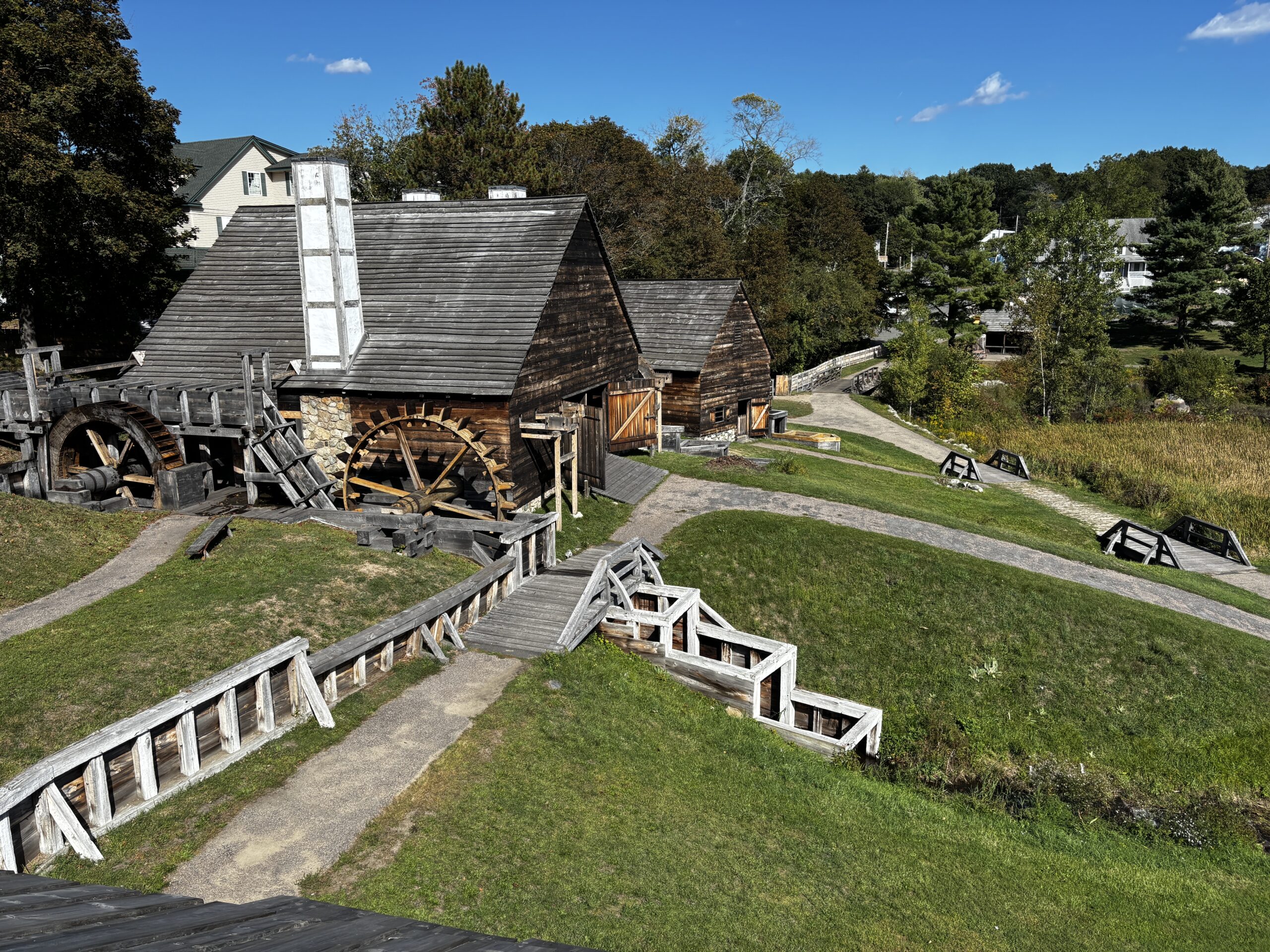 Seeing the waterwheel in action really brings home what it must have been like to have an iron works in town. This overshot wheel, powered by the flow of the Saugus River, drives the giant leather bellows, which supplies the continuous blast of air needed to keep the furnace roaring. The waterwheel also lifts the immense 500-pound hammer that pounds the raw pig iron into workable wrought iron bars. Ranger-guided tours often feature demonstrations, allowing visitors to see and hear this machinery come to life (I got to see just that when I visited).