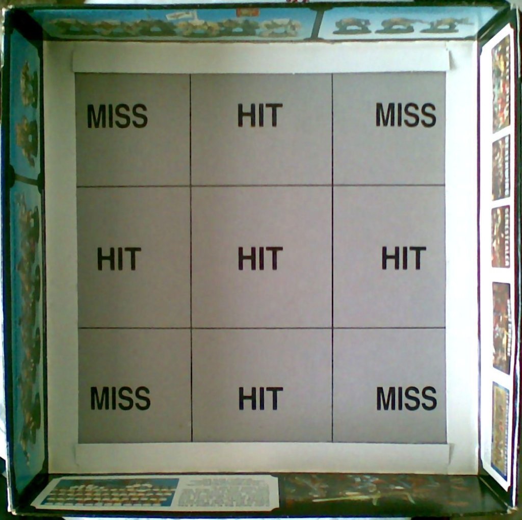 Then they take those dice and drop them from a height of at least 30 cm (so the rules state) into the box lid, where the Hit Chart is printed.