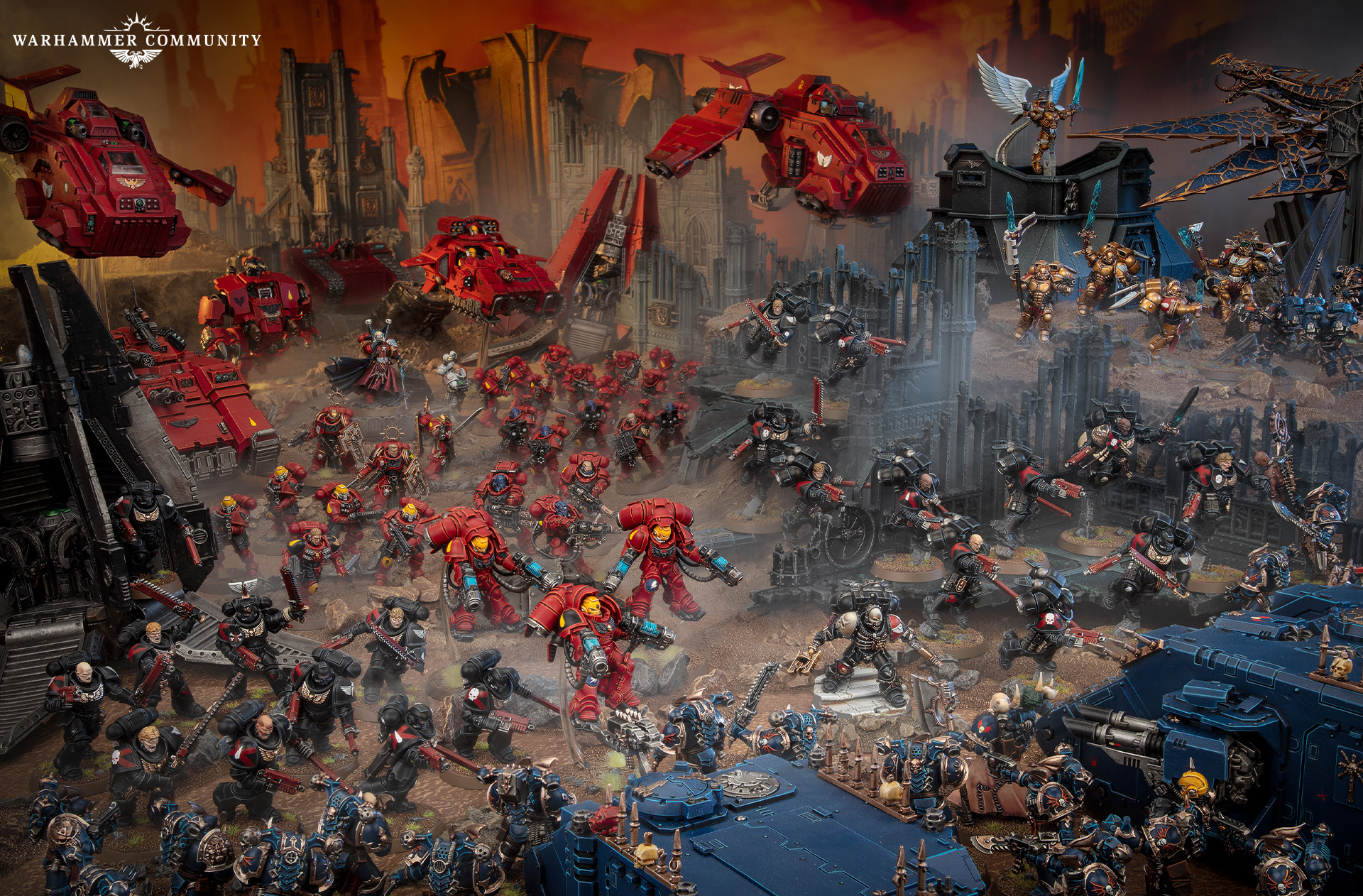 “The Red Thirst and the Black Rage will forever be the twin spiritual curses that the Blood Angels must hide from their allies for fear of censure. However, they can prove potent weapons of last resort when unleashed upon a determined foe. No Blood Angel takes such a decision lightly: to the sons of Sanguinius, a victory won through giving in to their Red Thirst is tainted at best, whilst to succumb to the Black Rage is no better than a living death. All this is little comfort to enemies facing the Blood Angels’ onslaught in such moments, however. Power-armored killers pound across the battlefield, shrugging off incoming fire as they close the distance with terrifying haste. Blood detonates from each crunching charge as the sons of Sanguinius rip their victims apart or carve them into gory ruin. At the very heart of the battle, the lost brethren of the Death Company fight with even greater fury, a whirlwind of rage-fuelled savagery that can end only with their deaths or those of all their foes.”