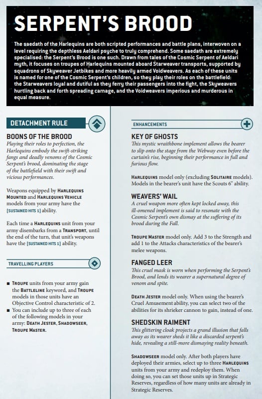 “This Detachment focuses on Harlequins specifically, ideal for anyone who wants to run either a pure Harlequin army or one that heavily focuses on these units. All of your Harlequin mounted and vehicle units gain Sustained Hits 1, your Harlequin infantry units gain Sustained Hits 1 in the turn they disembark. On top of this Harlequin Troupe go to OC 2 and become Battleline, and the restriction for most Aeldari armies that limit Harlequin characters to not be duplicated is removed.”