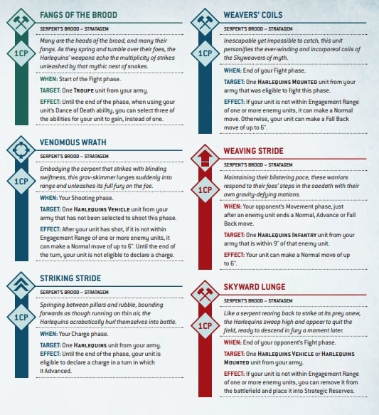 Furthermore, the enhancements really center around what characters you want to bring and gives them some utility. But really it’s the stratagems that highlight the Harlequin play style. High mobility and lethality all mixed into “hard to pin down” units.
