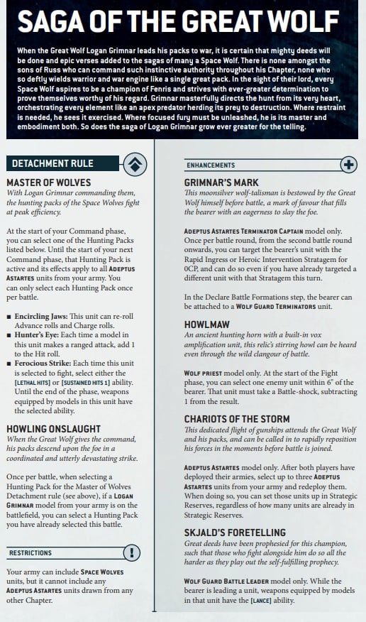 “This Detachment is open to all Space Wolves armies, but it certainly encourages you to use Logan Grimnar himself. There are 3 once per game Hunting Packs that buff your whole army for that turn. Either re-roll advances/charges, +1 to hit for shooting or in Melee your weapons have Lethal Hits/Sustained Hits 1. If you have taken Logan Grimnar, you can use one of the Hunting Packs an additional time.”