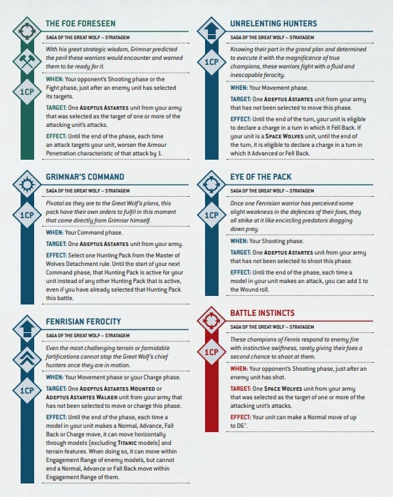 The Stratagems seem more like supportive stratagems that help to setup things to happen. Fenrisian Ferocity allows for the target unit to basically move through terrain freely. Then again there is also Eye of the Pack that just adds 1 to wound rolls in the shooting phase so it’s not like the army is going to lack a bite!