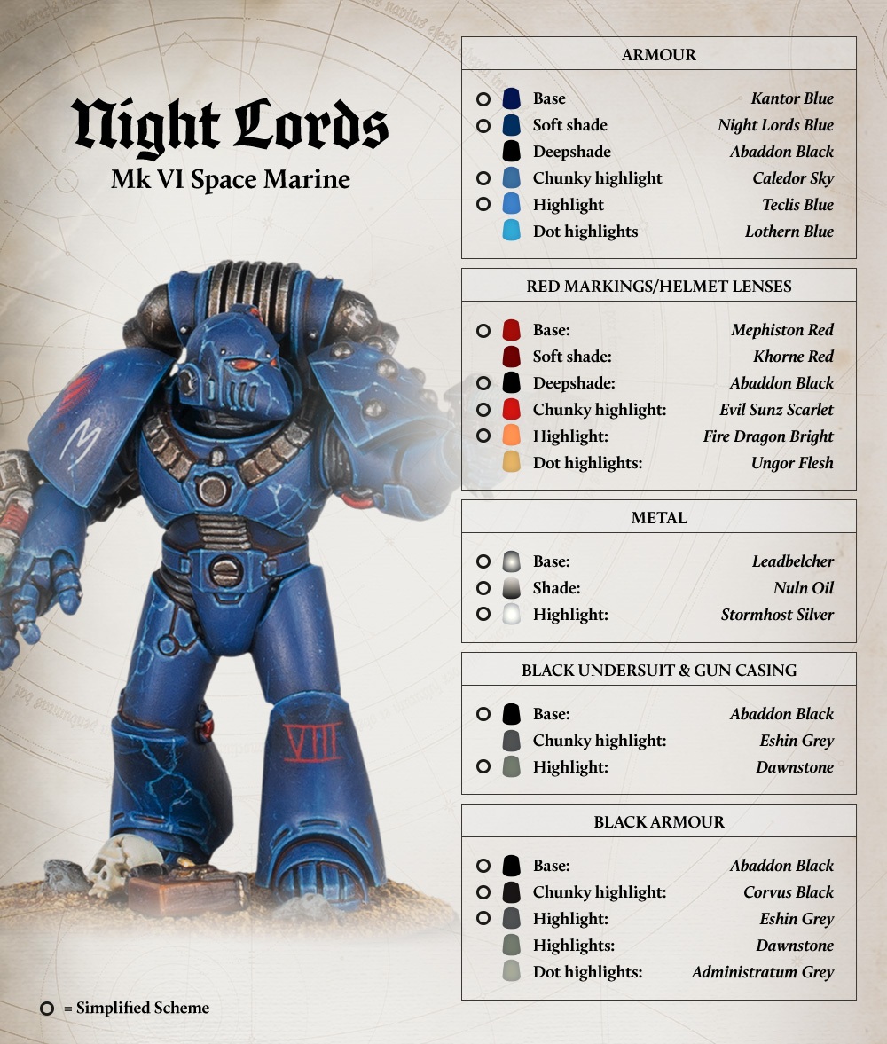 Personally, I think the real trick to the Lightning is to try and keep it subtle. It’s really easy to go overboard or “too thick” on the look. That said, the video tutorial does lay out the colors used and honestly has some good tips on how to practice. So give it a whirl if you’re a Night Lords fan!