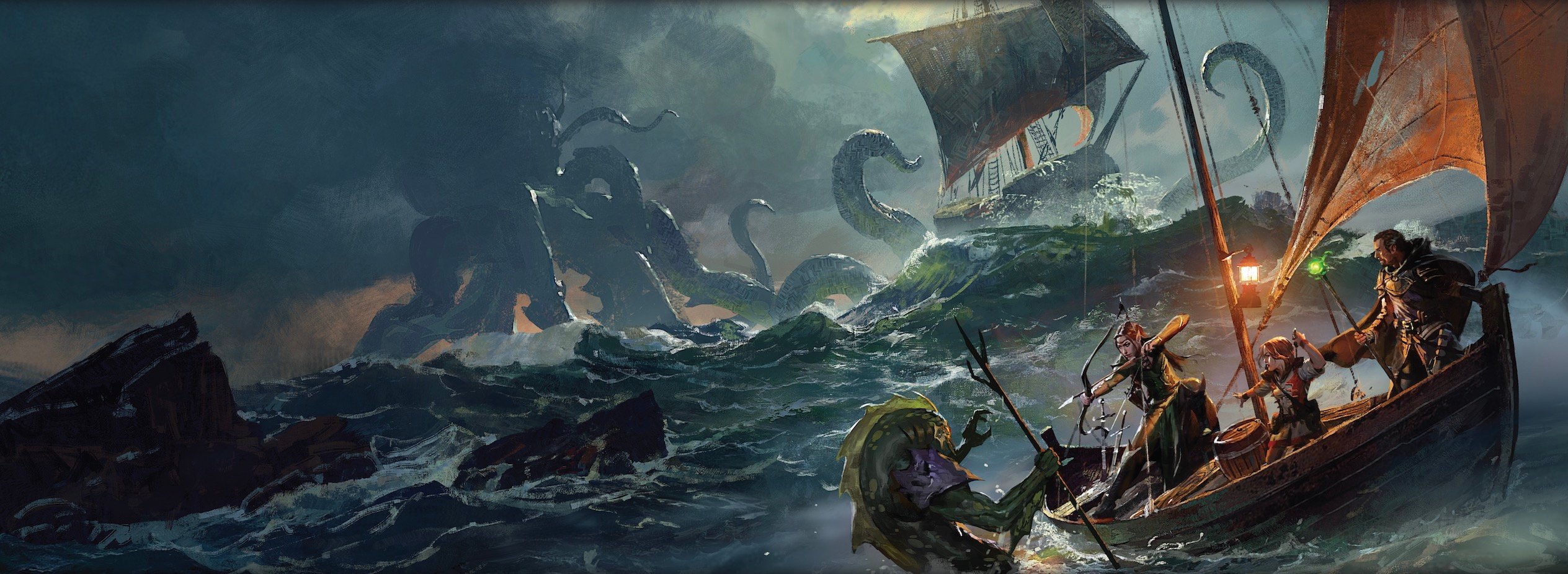 One of the classic conflicts of literature, fantasy and otherwise, is “man against nature”. This is an external struggle that pits characters against a force of nature itself. And there’s no force of nature that authors and writers love so much as the big briny deep. The ocean is full of all sorts of things, but you don’t even have to get out the Monster Manual to make an encounter at sea thrilling.