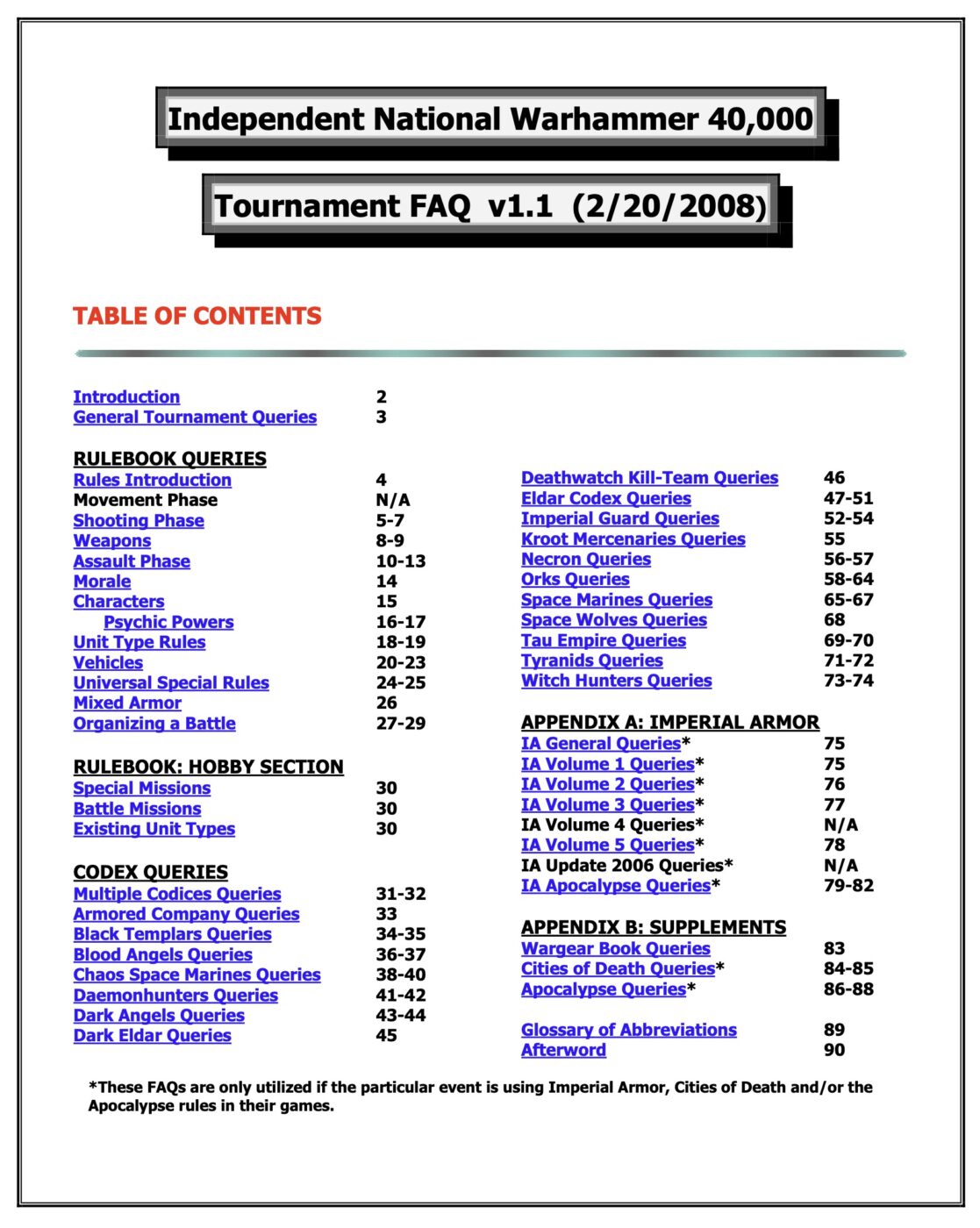 It was an interesting time and most likely this pushed events to start to figure out one FAQ to rule them. You would have resources and groups like DakkaDakka that would publish a cohesive FAQ. Adepticon had a FAQ. You had European groups that would publish their own events like the WTC FAQs. There would be arguments (on the big forums like Portent or Warseer) about who was right and if something was too broken. As you could imagine, over time, the smaller events would simply throw in the towel and decide to use the FAQ from larger groups such as the INAT FAQ (seen below), instead of making their own. Over a period of years from 4th Edition to 7th the number of these FAQs slowly but steadily decreased, but they were still often quite different from each other.