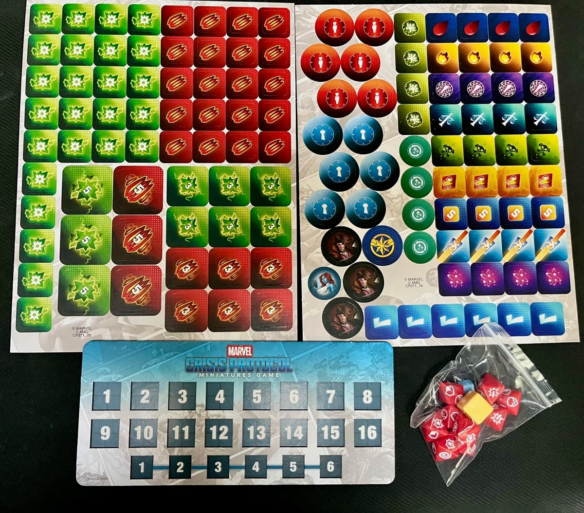 Speaking of tokens, you can see you get a FULL set including the correct sized objective markers and plenty of damage/energy tokens. It even comes with a turn tracker as well as 10 dice to play all your games with. All the status effects as well as custom tokens for the characters including are also a part of this token punchout set.