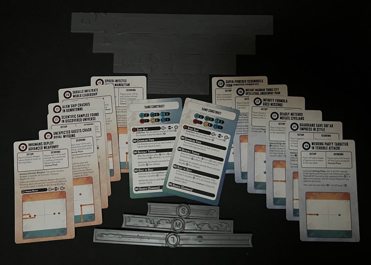 This set comes with a total of 12 missions. You’ll get 6 Extract and 6 Secure missions. You’ll also get the measuring tools. I included the two Sand Construct cards from Sandman above because they were the same size and I wanted to show that they were different than the mission cards. And speaking of cards…