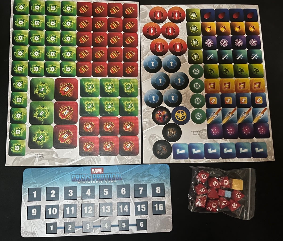 Just like the X-Men box, this one is also packed full of stuff. There’s almost too much to process here so let’s go step by step again. This one comes with it’s own version of the Tokens for the game. Notice the unique tokens included here are different that the X-Men one.