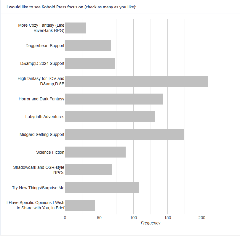 Then we get to the minority tastes, which the current audience requested in smaller numbers. That would be Science Fiction at 90 votes, and then the nice-but-not-quite-ToV trio of D&D 2024, Shadowdark, and Daggerheart tied at about 70 votes each. I was really, really hoping one of those three would stand out from the rest, but they’re statistically all about the same. I’ll keep watching them.