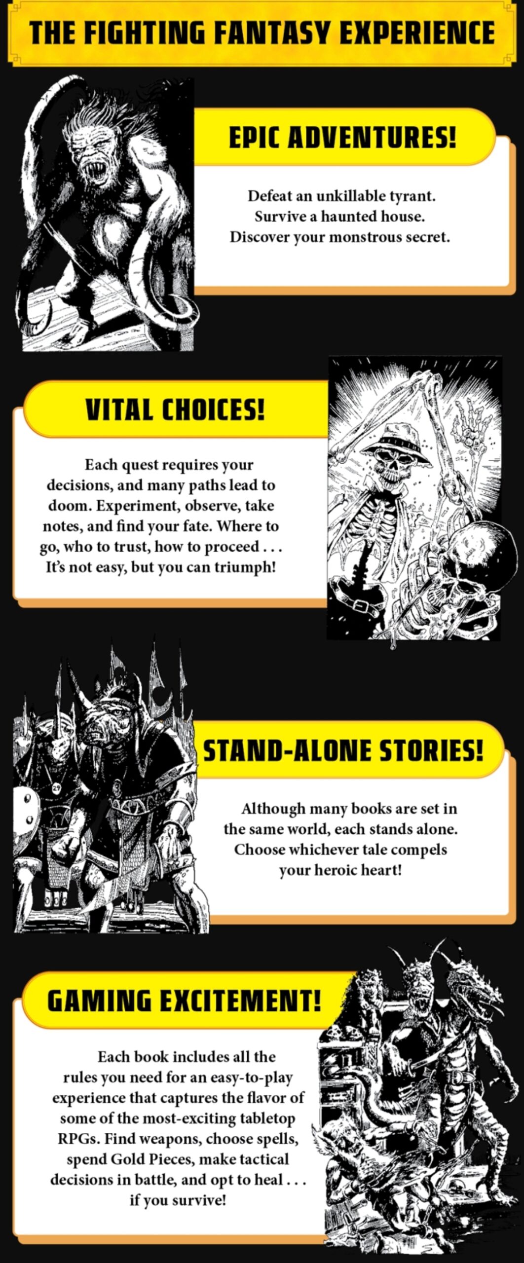 “The Fighting Fantasy series features epic fantasy adventures where you are the hero. In each book, your character’s life depends a bit on luck . . . but mostly on the decisions you make. Will you triumph . . . or meet a sad fate?