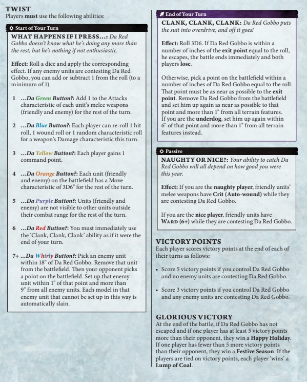 What’s really weird is that both players kind of want the Red Gobbo to stick around the whole game. The “Nice” player gets a defensive boost while contesting the Red Gobbo. The “Naughty” player gets an offensive one with Crit (Auto-wound) while contesting. And if the Red Gobbo makes it to an exit, the game ends and both players loose. It’s still a VP game and you want to score by controlling the Red Gobbo. That said, he’s got some pretty funky rules so…good luck with this one!