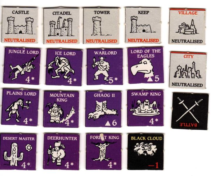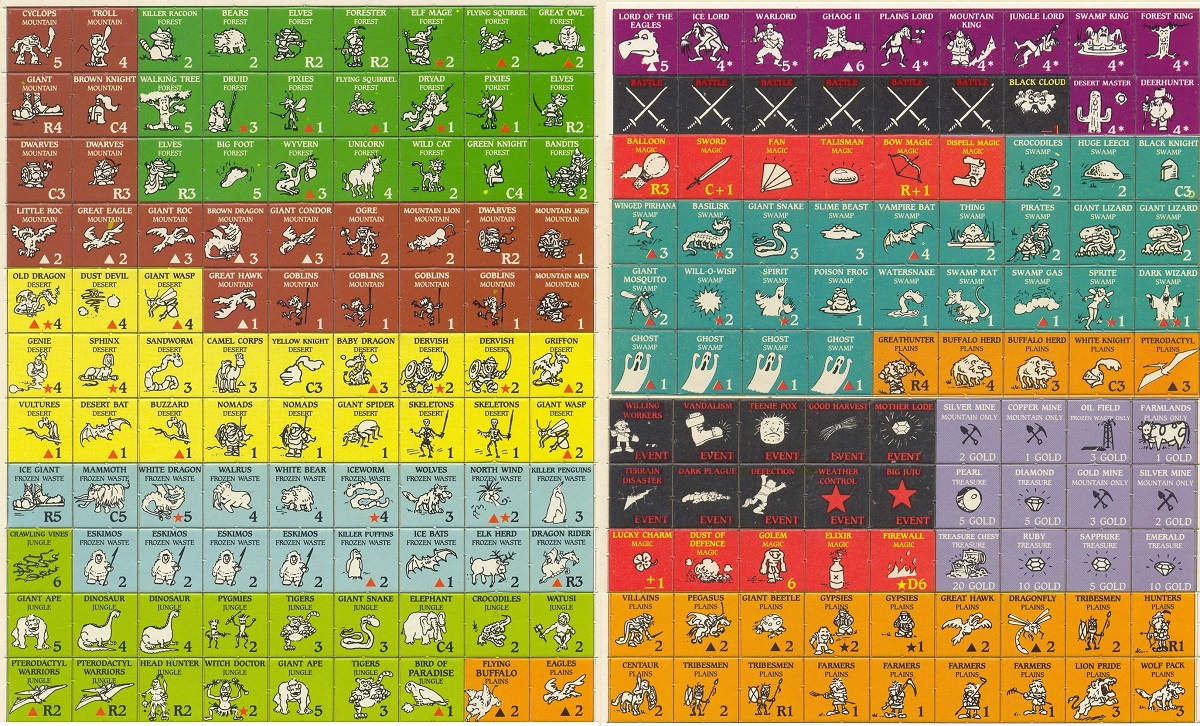 Each unit in the game is tied to a specific terrain type and won’t fight for a player who doesn’t control that terrain. But what’s neat about Kings & Things* is the mechanic they call “Bluff Creatures” that remain secret until they enter combat, then flee.